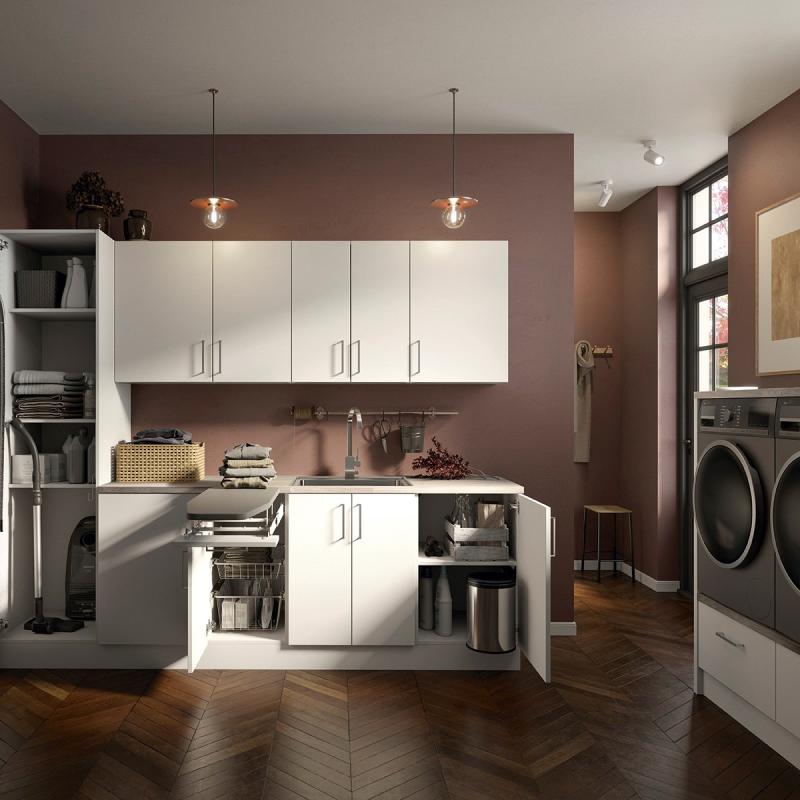 Høyskap B50 med hyller. Underskap B50. Underskap B40 med trådkurver og strykebrett. Underskap B60 for vaskekum. Underskap B50. Støtteben/Sokkel. Lys eik benkeplate. Overskap B50. Overskap B40. Overskap B60. Overskap B50. Tilgjengelig i Hvit, Grå og Sort matt utførelse.