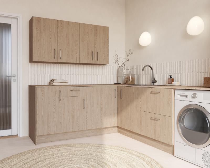 Hjørneløsning Eik natur med Eik natur benkeplate, bøyle Helix rustfritt stål, overskap, sokkel og dekksider til maskin. Tilgjengelig i flere farger og sammensetninger. Pris eks. vaskekum.